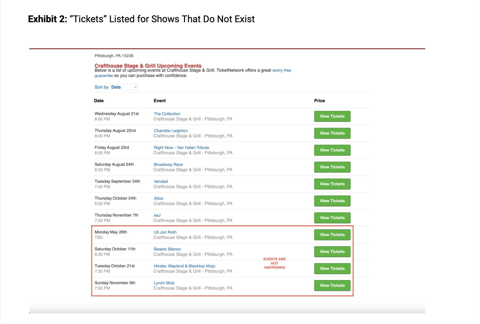 Furthermore, the lack of accurate listings - or any listings at all - on a number of Yelp’s predatory resale ticketing pages for venues is likely causing fans to miss out on shows. Yelp and TicketNetwork are deceiving fans into believing that the “tickets” they are selling include a comprehensive listing of all shows the venue or promoter is hosting. The widespread price gouging is misleading the public into thinking ticket prices are much higher than what independent stages actually charge, potentially discouraging them from buying tickets and harming our sales.