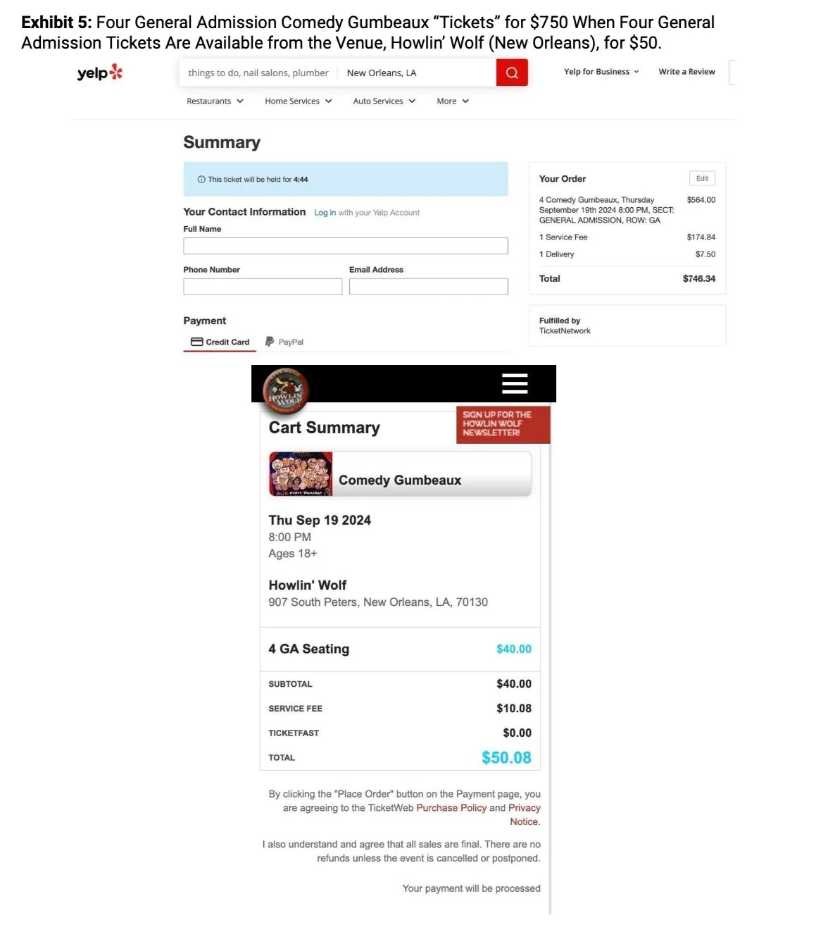 Hundreds of venues, festivals, and promoters nationwide have recently discovered that Yelp is placing buttons on their Yelp profiles that deceive consumers into believing they are buying tickets directly from the venue or promoter producing the show. However, those links actually redirect consumers to a Yelp-branded ticketing platform operated by a company with a long history of anti-competitive and predatory practices. They are selling resale “tickets”on Yelp that, in many cases, do not actually exist or are marked up two to four times the price of face value tickets that are often still available from the venue.