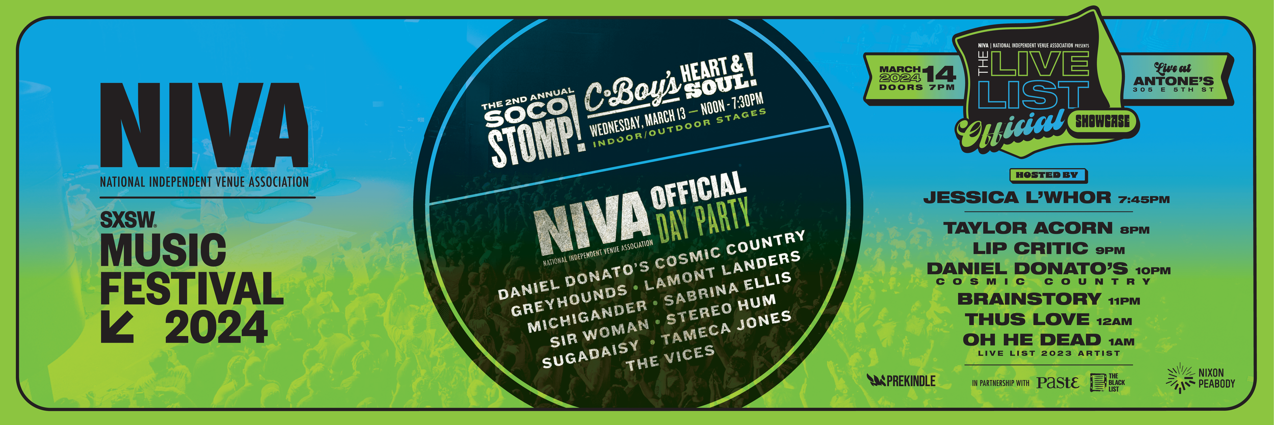 February 28, 2024 - The National Independent Venue Association (NIVA) will host two SXSW Official events during SXSW Music Festival this March. A robust lineup of performances will celebrate NIVA’s 2024 Live List, curated in partnership with Paste Magazine and the Blacklist and elevating rising, must-see artists who have launched their careers at independent venues across the U.S.